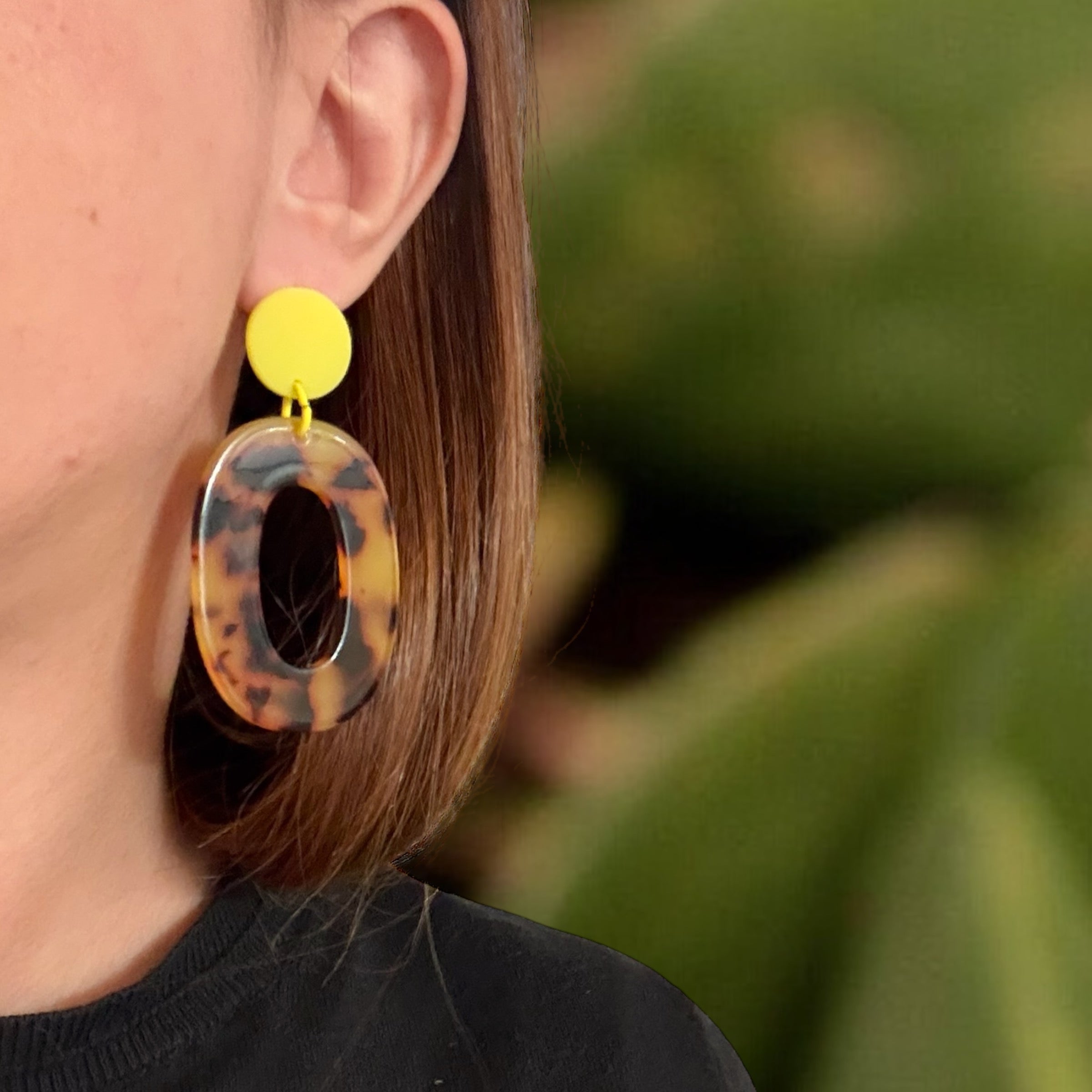 Les boucles d’oreilles en résine en écailles Maeva sont assemblées dans mon atelier à Marseille. Disponibles en deux coloris : noir et jaune fluo avec pendant en écailles