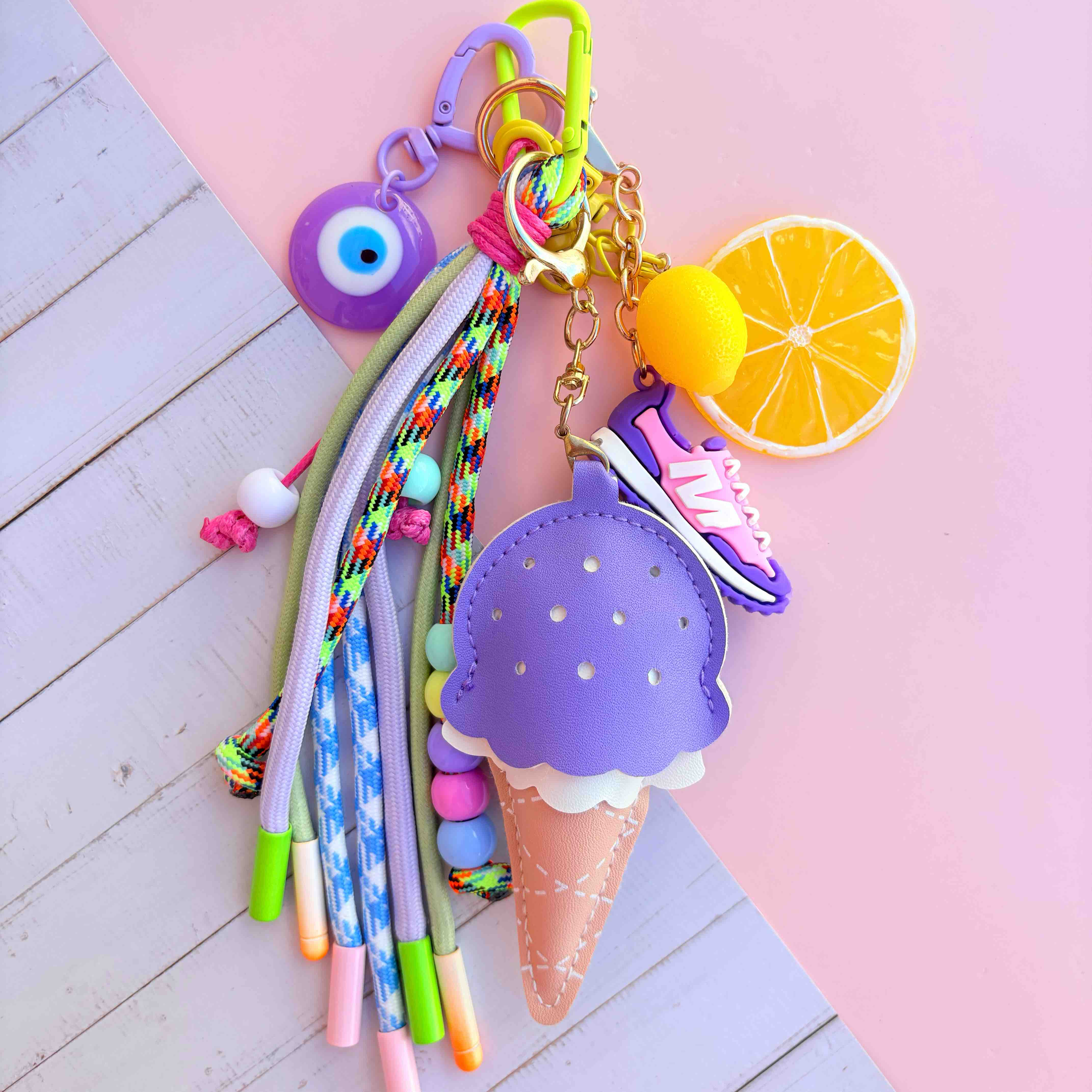 Ajoutez une touche de douceur et d’originalité à votre sac avec ce grigri de sac avec une glace violette citron Assemblé à la main dans mon atelier à Marseille, ce petit accessoire coloré et plein de charme est à la fois porte-bonheur, objet décoratif et unique